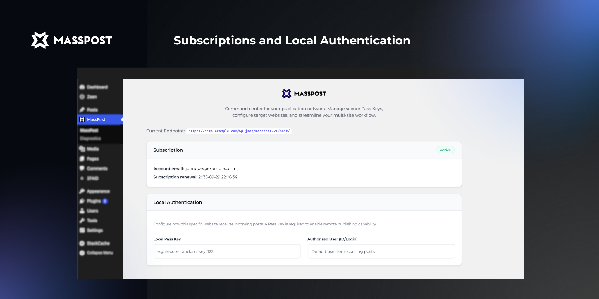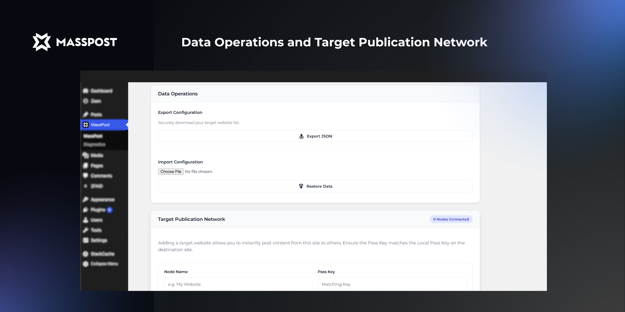 /wp-content/plugins/masspost/directory, or install via the WordPress admin, on both the current and target websites. - Activate the plugin through the “Plugins” screen.